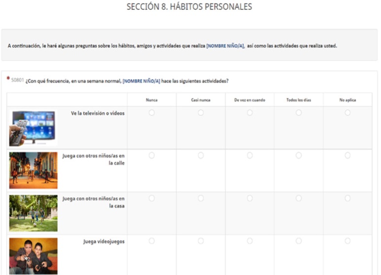 El tiempo promedio de aplicación de la encuesta fue de 45 minutos para los niños/as de 11 y menos, y de 1:20 horas para los/as jóvenes de 12 a 17 años, dependiendo de la edad, las experiencias de victimización y de búsqueda de ayuda, ya que una respuesta afirmativa generaba que se desplegaran preguntas subsecuentes. La encuesta se programó en la plataforma LimeSurvey, y se aplicó mediante dispositivos electrónicos (tabletas). Se incluyeron imágenes libres de derechos de autor y culturalmente adecuadas al contexto mexicano para favorecer la comprensión y reducir el cansancio tanto de la persona entrevistadora como de la persona entrevistada (véase Imagen 1).