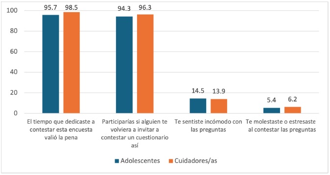 Es posible que las preguntas generen incomodidad, molestia y estrés, pero solo para una minoría: 14.5% de los/as adolescentes y 13.9% de los cuidadores/as, y 5.4 y 6.2%, respectivamente, se molestó o estresó al responderlas. A pesar de esto, la mayoría de los que sintieron molestia volvería a participar en un estudio semejante (79% de los/as jóvenes y 83% de los/as cuidadores).