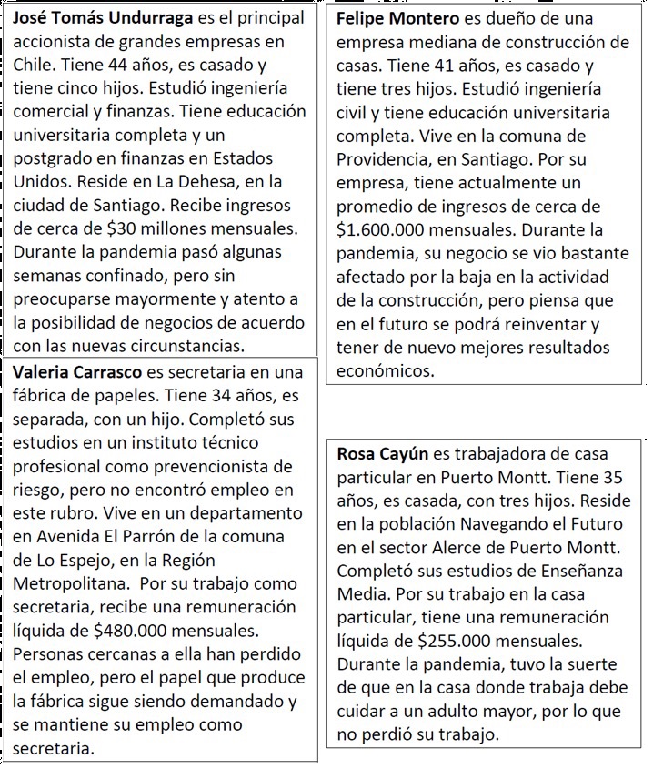 Las viñetas presentan una descripción de dimensiones cruciales en la literatura sobre clases sociales, estratos o posiciones sociales, tales como ocupación e ingresos. Esa descripción multidimensional incluyó rasgos salientes o estilizados que fueron discutidos en grupos focales previos realizados antes y después del estallido social de octubre de 2019, entre ellos grupos virtuales durante la pandemia tanto en Santiago como en Puerto Montt. Cada personaje es descrito en una viñeta acompañado por un texto lo más sencillo posible. Agregamos información sobre su situación durante la pandemia, debido al impacto de la crisis sanitaria.