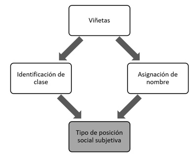 De este modo, se combinaron ambas respuestas, tanto la identificación de la persona con una viñeta, como el nombre asignado al grupo representado en esa viñeta, para obtener el posicionamiento social subjetivo de la persona. Se trata por tanto de un procedimiento indirecto para construir la identificación subjetiva de los encuestados. Es decir, en lugar de utilizar una escala en la que el encuestado selecciona su identificación de estrato o clase para enseguida indagar a qué tipo de nombre se asocia esa autoidentificación, en este trabajo la persona escoge una viñeta representativa de un estrato social con la cual se autoidentifica y se analiza el nombre que el encuestado le asignó. Por medio de este método se puede esperar una mayor variabilidad que con otros procedimientos basados también en preguntas abiertas, como solicitar al encuestado indicar directamente a qué clase social cree que pertenece (Salata, 2015). En síntesis, la metodología aplicada para la definición del tipo de posición subjetiva se esquematiza en la figura 2.