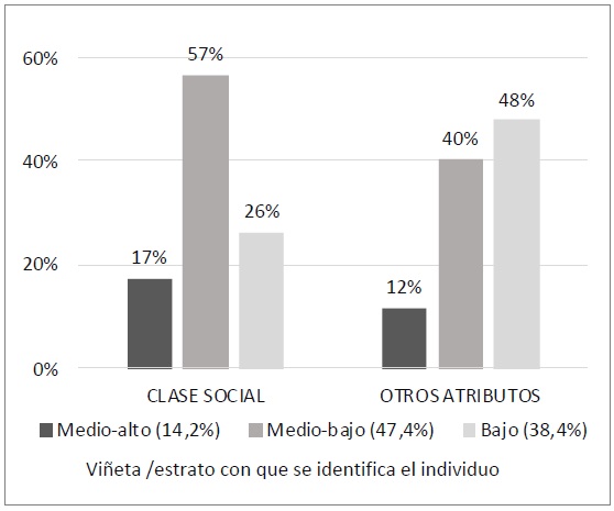 Por un lado, como es razonable para una sociedad como la chilena, entre los encuestados la identificación con las viñetas de estrato medio-bajo y bajo es bastante mayor que con el estrato medio-alto. La autoclasificación en el estrato medio-bajo se acentúa entre quienes usan una noción de clase social como criterio para nombrar su posición social y en alguna medida esto ocurre también en los que se identifican con el estrato alto. En cambio, contrariamente a lo que se podría intuir, entre quienes asignan a su posición social un nombre basado en otros atributos, predominan los encuestados que se identifican con la viñeta de estrato bajo. Entre quienes se identifican en el estrato bajo, es más frecuente que se denominen como pobres que como clase baja u otra clase social. Así, de acuerdo con la metodología de este estudio, asumir una posición subjetiva de clase social es más propio de quienes se identifican en los estratos medios que en el estrato bajo.