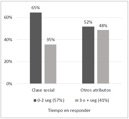 Una elevada proporción de quienes se nombran como clase social responde de manera casi instantánea, en menos de tres segundos, por ejemplo, los que se denominan clase baja. En contraste, la demora en responder es proporcionalmente mayor entre quienes nombran su posición social con base en otros atributos como el esfuerzo. Pero esa demora para nombrar atributos que no son de clase social, no incluye a quienes se designan como pobres, quienes responden en un tiempo similar al de quienes asumen una posición de clase social. De este modo, la certidumbre para nombrarse como clase social o como pobre, en comparación con la demora para encontrar otro nombre, indica que lo primero requiere un trabajo cognitivo más simple y se trata de una expresión que cuenta con mayor consenso social.