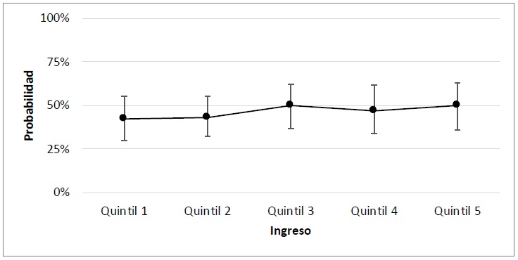 La figura 5 ilustra la carencia de efecto de la variable ingreso en las personas encuestadas, al no observarse diferencias significativas entre los diferentes quintiles en sus probabilidades predichas. Si se controla el resto de las variables, la probabilidad de identificarse con una clase social oscila siempre entre el 30% y 60% para los distintos quintiles de ingreso, y se ven siempre superpuestos sus intervalos de confianza. Por ello, se rechaza la hipótesis H1a de que a mayor nivel de ingreso de las personas, es menor la probabilidad de identificarse con una clase social. Ello reafirma lo que se observa en los modelos de regresión que excluyen a las otras dos variables socioeconómicas y muestran un efecto no robusto (anexo 3).