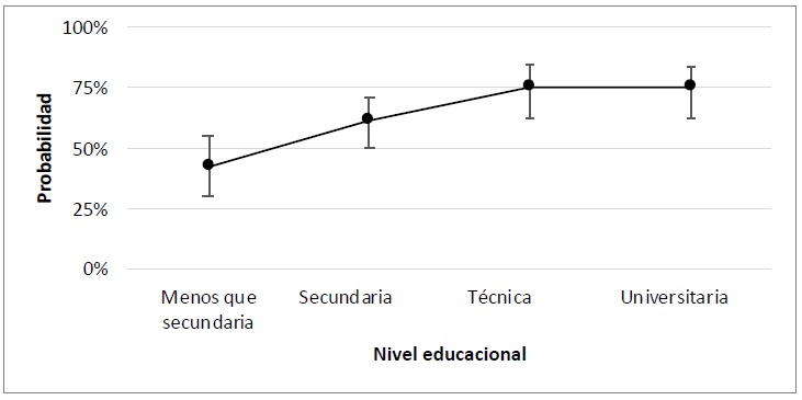 Al contrario, las probabilidades predichas de identificación con una clase social según nivel educacional son estadísticamente diferentes entre sí, como se observa en la figura 6.