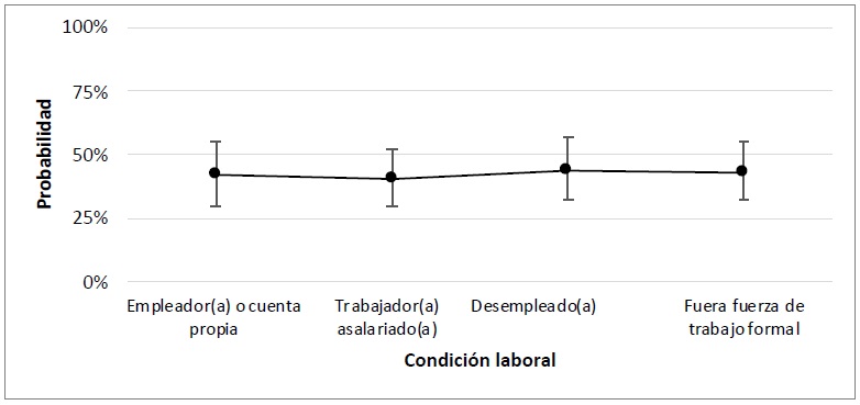 Todos los intervalos referidos a la condición laboral oscilan en probabilidades entre el 30% y 57% y no expresan diferencias estadísticamente significativas entre sí (figura 7). Se rechaza la hipótesis H1c de que ciertas categorías ocupacionales tienen una menor probabilidad de identificarse con una clase social que el ser trabajador(a) remunerado(a), así como la hipótesis 2 de que la condición laboral es la dimensión con mayor influencia en la probabilidad de que las personas encuestadas se identifiquen con una clase social. Esto contrasta con la marcada influencia de tener un mayor nivel educacional.