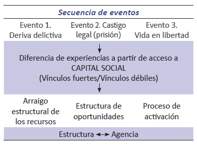 Una vez que las entrevistas fueron transcritas, se sometieron a revisión y clasificación analítica. En ese proceso se identificaron los casos más contrastantes en función de los aspectos de interés (origen, ingreso en el delito, experiencia de castigo y vida en libertad). De ahí se pasó a una segunda fase donde se examinaron las características más específicas referidas a las manifestaciones propias del capital social en relación con la secuencia de eventos de interés, con lo que se sigue el esquema de análisis ofrecido en la figura 1.