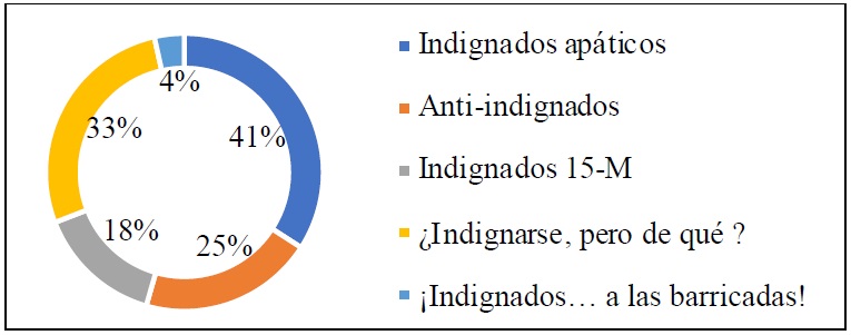 El análisis de los datos sometidos a la metodología descrita en la sección anterior arroja cinco perfiles de individuos claramente diferenciados. Las figuras 2 y 3 muestran esquemáticamente los perfiles de «indignados» a partir de la interpretación de los grupos, el porcentaje que concentra cada uno respecto del total y los grupos estadísticamente significados por el perfil ideológico.