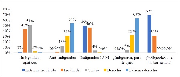 De acuerdo con la interpretación de los resultados, este grupo se sitúa a mayor distancia del resto, cuestión comprensible puesto que no creen que haya motivos para la movilización. Está constituido por la suma de la derecha y extrema derecha, cuya suma alcanza el 95%, más un residual 5% del centro.