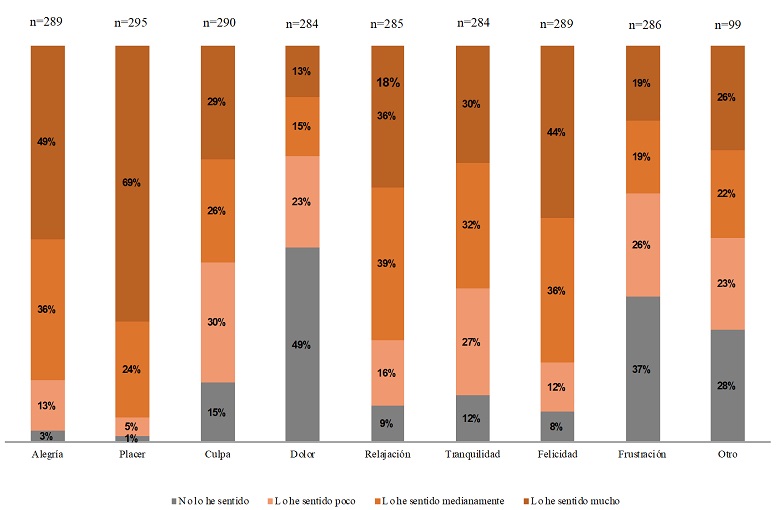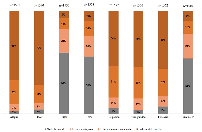 Dentro de las emociones negativas tenemos que todas se experimentan en meyor medida dentro de las relaciones sexuales con personas que no son la pareja. Como se mencionó anteriormente, la más acusada es la culpa venida seguramente del sentimiento de transgresión que implica violar las normas de la fidelidad y la monogamia que rigen en la cultura hegemónica. En el caso de las emociones negativas, las opciones de “lo he sentido mucho” y “lo he sentido medianamente” resultan, para las relaciones extraconyugales, la culpa con un 55%, la frustración con un 38% y el dolor con un 28%. Por lo que respecta a las relaciones con la pareja, el dolor encabeza la lista con 24%, le sigue la frustración con 22% y la culpa con 18%.