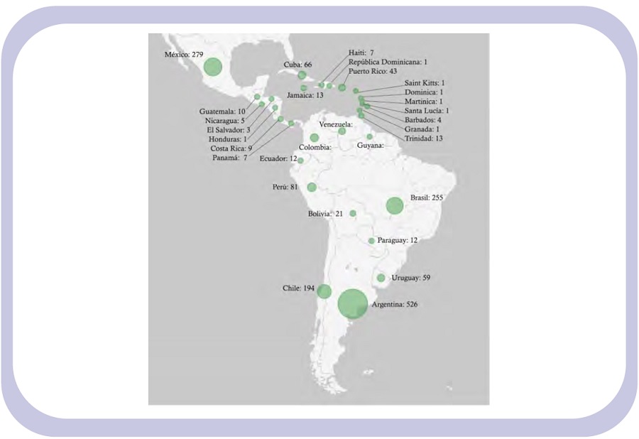 Esta perspectiva espacial contribuyó a brindarnos un acercamiento comparativo a nivel nacional y nos condujo a la constatación de una asimétrica distribución geográfica de las becas, que se muestra en el mapa de la Figura 1. Argentina es el país que más estipendios recibió a lo largo de las ocho décadas de existencia del programa, contabilizando 526. Un segundo grupo lo conforman México, Brasil y Chile, y un tercero los países con entre 10 y 81 becas, que son de las distintas zonas de la región. Por último, 14 países centroamericanos y caribeños recibieron menos de diez becas a lo largo de la existencia del programa