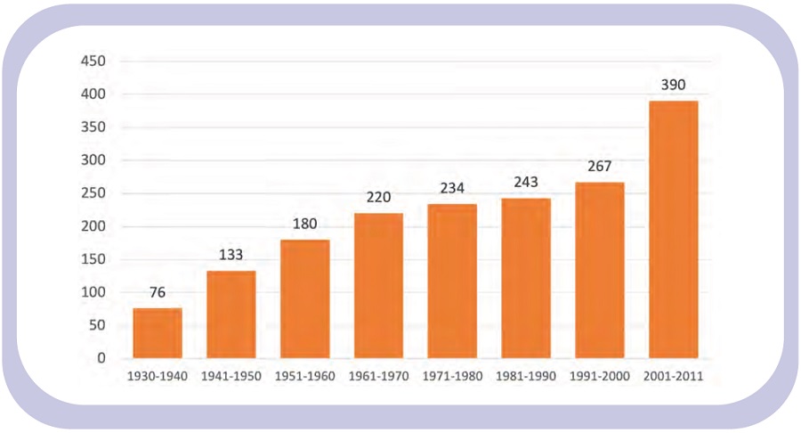 Retomando lo planteado en el punto anterior, la evolución de la cantidad de becas sufrió un aumento muy paulatino (ver Figura 2). Hasta 1940 sólo se otorgaron 76 becas, pero en la década siguiente este número se dobló. A partir de entonces el crecimiento fue acotado. De hecho, entre 1971 y 2000 el número osciló en torno a las 240 becas aproximadamente, sin mayores cambios. Sí se nota un salto brusco con el nuevo milenio: desde 2001 y hasta la cancelación del programa se contabilizaron 390 personas financiadas.