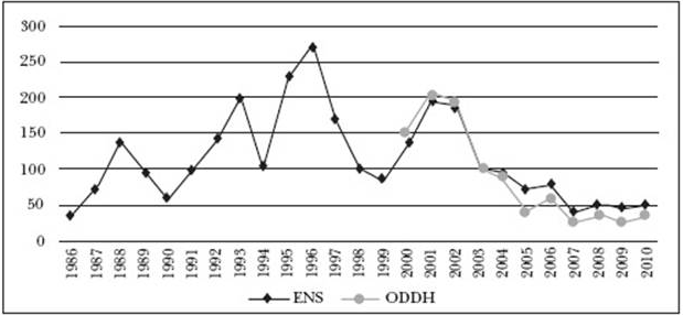 La violencia sufrida por los sindicalistas tiene una constante histórica, relacionada directamente con el proceso político colombiano y el conflicto político armado. En medio del escalonamiento del conflicto armado provocado por la expansión de los ejércitos para-militares en los últimos treinta años, los trabajadores sindicalizados al igual que líderes sociales y comunitarios fueron perseguidos en procesos de estigmatización sociopolítica donde se relacionaba al sindicalismo y las reivindicaciones redistributivas con la actividad subversiva. 20 Particularmente, los sindicalistas han sufrido una violencia sostenida que se manifiesta en una gran cantidad de violaciones a sus derechos a la vida y la libertad. Algunos autores han calificado dicha estrategia de violencia y persecución como la búsqueda del "exterminio sindical"; 21 sólo los homicidios contra sindicalistas registraron desde 1986 hasta 2010 un total de 1 858 muertes violentas, y tan sólo en el periodo 2000 y 2010 un total de 1057 según la Escuela Nacional Sindical y 975 según el Observatorio de Derechos Humanos de la Presidencia (véase la Gráfica 1).