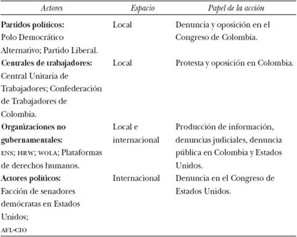 La diferenciación entre el tipo de actores (Cuadro 1) permite comprender los roles cumplidos en la red transnacional que se articularon en defensa de los derechos de los trabajadores y el tipo de presión diferenciada sobre el Estado colombiano. En el nivel local encontramos la presencia de actores tradicionales como los propios sindicatos, los partidos políticos, movimientos sociales y las organizaciones no gubernamentales especializadas; en el nivel internacional tenemos actores institucionales gubernamentales como los congresistas estadounidenses, la AFL-CIO como la mayor central sindical norteamericana y organizaciones no gubernamentales con amplia trayectoria de denuncia. Cada tipo de actor en su ámbito de acción fungió como un nodo en una red de demanda y defensa de los derechos de los trabajadores sindicaliza-dos en Colombia, lo que permitió que se combinara la denuncia en espacios institucionales como los congresos, la protesta callejera y la producción de información y la denuncia pública de la violencia antisindical en ambos países.
