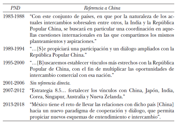 Unida a la idea del activismo diplomático convertida en práctica transexenal, también es posible encontrar en los pnd, una preocupación por la diversificación de las relaciones exteriores mexicanas, asociada a un acercamiento a la región de Asia-Pacífico.24 A la par, encontramos en los pnd, con excepción del de Fox, propuestas específicas para ampliar y fortalecer los vínculos con China (véase el cuadro 1). Es decir, a nivel formal, la búsqueda de un acercamiento con China ha sido un proyecto de política exterior de México desde la década de 1980.