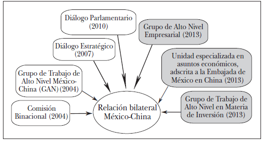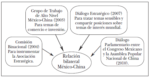 – Ya en el periodo de Calderón, durante su primer viaje a China en 2008, se acordó la creación del Diálogo Estratégico para tratar los temas sensibles de la relación y compartir posiciones sobre los principales temas y problemas globales.51 A la fecha, este mecanismo ha sostenido tres reuniones: la primera en agosto de 2009, en la ciudad de México, la segunda en Beijing, en 2011, y la tercera en octubre de 2013, en la ciudad de México.