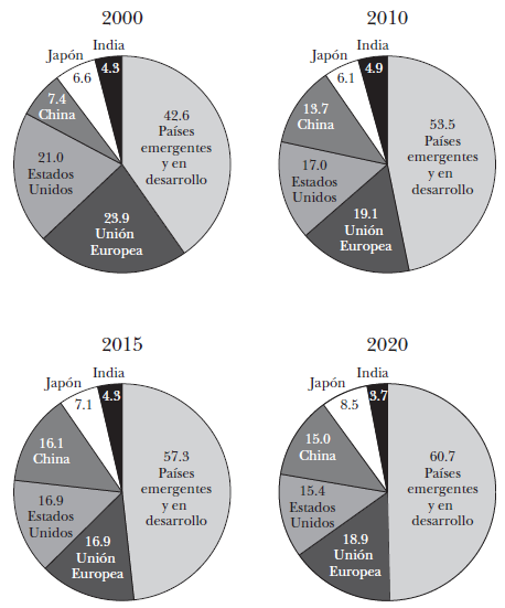 Durante los últimos doscientos años, la economía internacional ha sido dominada por los países del Atlántico Norte, en primer lugar por Europa Occidental, por sí sola, y posteriormente por Europa y Estados Unidos, con un claro liderazgo de este último a partir de la conclusión de la Segunda Guerra Mundial. Sin embargo, en los próximos años es previsible que se consolide la pérdida del peso relativo del eje del Atlántico septentrional en la economía internacional –que empezó a sentirse desde hace dos décadas y se aceleró con la Gran Recesión– en favor de los países emergentes, especialmente aquellos en Asia.