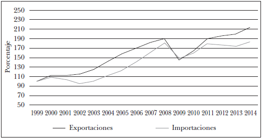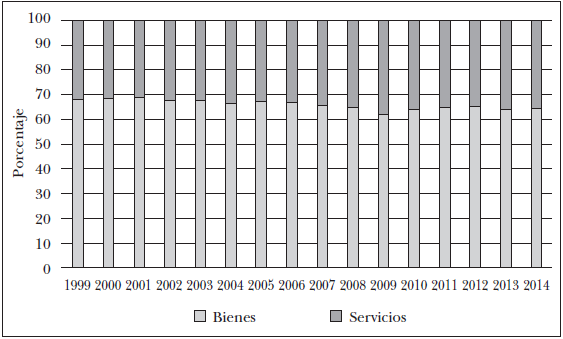 La estructura del comercio entre ambas partes en lo que corresponde a bienes y servicios se ha mantenido relativamente estable durante los pasados quince años (gráfica 2). En 1999, el comercio de bienes representó casi 70% de la relación comercial bilateral, al tiempo que en 2014 esta proporción fue de 64%, una disminución de 9 o 0.6% anual.7 Así, el intercambio de bienes continúa siendo prevalente en la relación comercial bilateral.