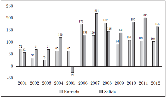 En lo que respecta a la inversión extranjera directa (IED) entre la Unión Europea y Estados Unidos, en 2012 los flujos bilaterales alcanzaron un monto de 271 000 millones de dólares. Los flujos de IED desde Estados Unidos hacia la Unión Europea fueron de 166 000 millones de dólares, lo que implicó un crecimiento de 183% con respecto a 2001, es decir, una CAGR de 10%. Los flujos de IED desde la Unión Europea hacia Estados Unidos en 2012 sumaron 105 000 millones de dólares, marcando un crecimiento de 45% con respecto a 2001, es decir, una CAGR de 3%. En general, para la mayor parte de los años entre 2001 y 2012 la IED de Estados Unidos en la Unión Europea fue mayor que la IED de origen europea en Estados Unidos (gráfica 5), además de que su tasa de crecimiento en el periodo fue significativamente mayor.12