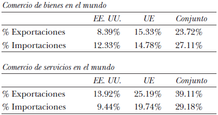 Estados Unidos y la Unión Europea tienen un papel esencial en el sistema de comercio mundial. Estados Unidos aporta 8.3% del total de exportaciones de bienes en el mundo y 12.3% de las importaciones. De manera similar, su participación en las exportaciones mundiales de servicios es de 13.9% del total, mientras que importa 9.4% del total. Por su parte, las exportaciones de bienes de la Unión Europea al mundo equivalen a 15.3% del total, mientras que sus importaciones son de 14.7% del total mundial. En lo que corresponde al comercio de servicios, la Unión Europea aporta 25.1% de las exportaciones mundiales y 19.7% de las importaciones (tabla 1).3