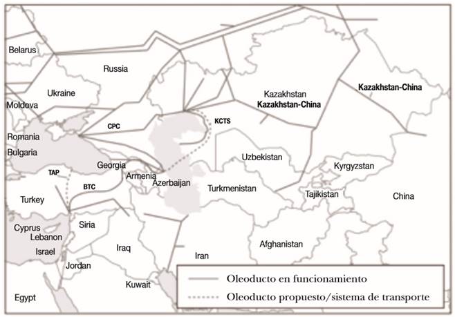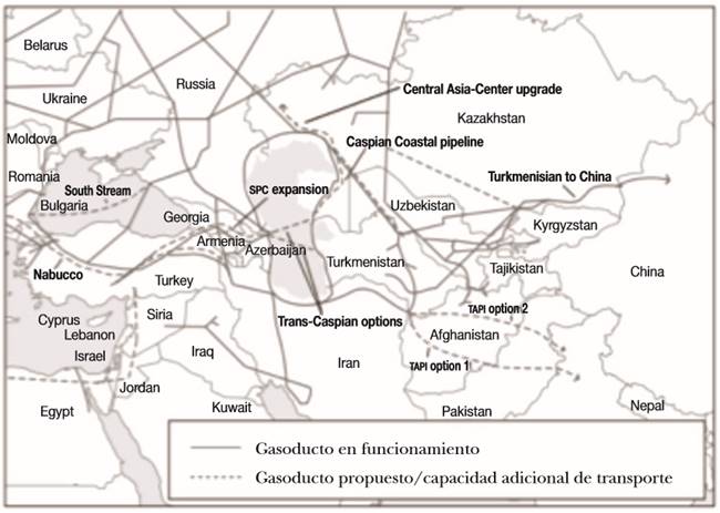 La independencia de los países del Cáucaso y de Asia Central, en la década de 1990, llamó la atención de los países occidentales, así como de las principales empresas privadas y estatales productoras de energía del mundo: Royal Dutch Shell, Arawak Energy Ltd., bp, ExxonMobiel, Chevron, Lukoil, Surgutneftegaz, Gazprom, ConocoPhillips, Dragon Oil, Chinese National Petroleum Company, Petronas, entre otras, por tener algunas de las mayores reservas de gas en el mundo, así como importantes reservas de petróleo.9 Geográficamente, el mar Caspio se conforma de varios estados ribereños: Azerbaiyán, Irán, Rusia, Kazajstán y Turkmenistán, además de Georgia, que está involucrada en la salida de los hidrocarburos hacia los mercados internacionales. El mar Caspio, en cuanto a su geopolítica, representa un escenario de conflicto entre las diferentes potencias, porque en él se libra una batalla sin igual por el control de los oleoductos y por la explotación de los hidrocarburos.10 Por ejemplo, Moscú ve con recelo los planes de Turkmenistán de construir nuevos oleoductos para transportar el energético principalmente a Europa sin tener que usar las tuberías rusas. Esta situación se agravó aún más, cuando, en 2009, tras la ruptura de un extremo de la tubería que transporta el gas turkmeno, se obstaculizó la exportación de éste a Rusia (por entonces su principal cliente), lo que llevó al agravamiento de las relaciones con la federación rusa. En estas circunstancias, Moscú ha tratado de evitar resolver el estatus jurídico del mar Caspio, lo que se ha reflejado en una disminución en el flujo de energéticos de los estados ribereños por medio de esta fuente de recurso.11