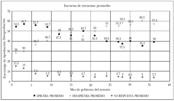 Cómo fue que se movieron los niveles de aprobación de Calderón durante su mandato, cabría preguntarse en este punto, y cuáles han sido los de Peña Nieto en lo que va de su gobierno. Aunque las mediciones varían según la casa encuestadora, en un poll de polls (promedio de diversas encuestas: Buendía & Laredo; Parametría; GEA-ISA; Consulta Mitofsky) se puede observar que, en el caso de Calderón, la aprobación se mantuvo en un rango de entre el 44 y 68%. Aun cuando los ciudadanos se volvieron más críticos sobre la violencia que asolaba el país, daban buenas calificaciones a su gestión en general, a causa, muy probablemente, de los niveles de estabilidad económica que vivimos por entonces (se registró la inflación más baja de la historia y hubo una acumulación histórica de reservas internacionales).