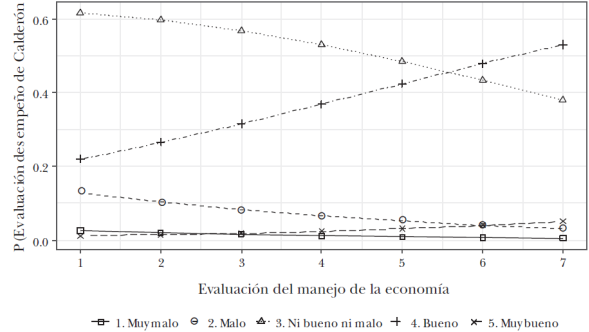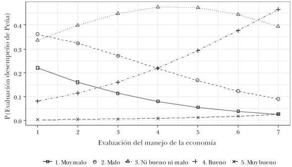 La bibliografía que sobre la aprobación presidencial se basa en datos individuales se concentra en distintas visiones de cómo los individuos conectan sus percepciones sobre la economía con la evaluación del titular del Ejecutivo. Un lado argumenta que el público, en el agregado, actúa de manera sofisticada al castigar o premiar a los presidentes, basándose en sus expectativas de desempeño económico futuro;11 otro, que el público evalúa condiciones pasadas y presentes para castigar o premiar al Presidente.12