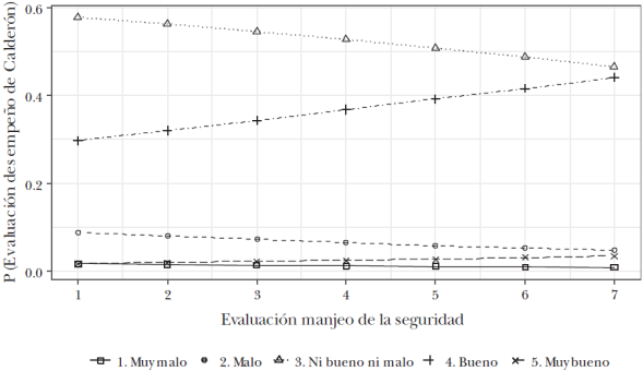 Romero (art. cit.), primero, y Romero, Magaloni y Díaz-Calleros,17 después, analizan la relación entre distintas dimensiones de seguridad pública y la aprobación del presidente Calderón. Entre sus hallazgos, destacan que las evaluaciones económica y de seguridad son las variables que más efecto tienen en la probabilidad de evaluar en forma positiva o negativa al Presidente. El acuerdo con la estrategia del Presidente tiene también un efecto relativamente grande sobre la probabilidad de evaluar en forma positiva su trabajo.