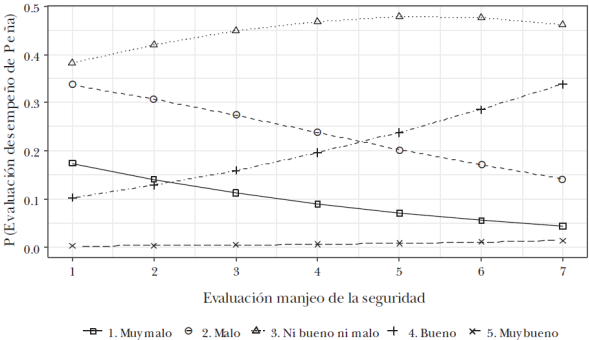 En el caso de Peña Nieto, en las categorías de aprobación malo y bueno, el impacto de la seguridad sobre su aprobación es muy alto. En el caso de la opinión positiva, la probabilidad de aprobación cambia del 10 al 33 % (23 puntos porcentuales), cuando un individuo pasa de opinar que el trabajo del gobierno en seguridad la mejora nada, a la opinión de que la mejora mucho; en el caso de la opinión negativa (mala), el cambio es de menos 13 puntos porcentuales. Una posible razón del mayor impacto de la seguridad en la aprobación de Peña Nieto sobre la de Calderón puede estar relacionada con la cobertura noticiosa de la prensa. En ese sentido, es relevante mencionar que, aunque el tema con mayor cobertura en los diarios fue el económico, la proporción de encabezados de seguridad fueron más en el periodo de Peña Nieto que en el de Calderón (el doble, en dos de los tres diarios revisados).