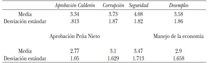 Como puede verse en el Cuadro 1 (p. 647), los datos de LAPOP muestran que la media de aprobación para Calderón al momento de levantarse la encuesta (febrero de 2008) es mayor que la de Peña Nieto (febrero de 2014). Asimismo, en los rubros de evaluación de desempeño relacionados con el combate a la corrupción, seguridad y desempleo/manejo de la economía, la media es mayor para Calderón que para Peña.