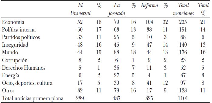 Es importante subrayar que el análisis de prensa muestra una coincidencia significativa entre los temas que aparecieron en primera plana en los diarios nacionales y los considerados por el público como los más relevantes. Como se aprecia en el Cuadro 2, de la siguiente página, para el periodo de 2007-08, el tema económico (21% de las noticias en primera plana), seguido de política interna (14%) e inseguridad (13%), fue el que más apareció en los tres diarios nacionales revisados. Para el periodo 2013-14, nuevamente el tema económico fue el que más apareció en dichos diarios (23%), seguido por el tema de inseguridad (14%) y el de asuntos internacionales (13%). Los temas económicos y de seguridad fueron los que prevalecieron, tanto en titulares como en encabezados de los tres diarios. Aunque los temas económicos tuvieron mayor cobertura que todos los demás temas en los tres diarios analizados, en La Jornada y El Universal la proporción de encabezados de seguridad sobre el total de titulares fue mayor que la de los temas económicos.