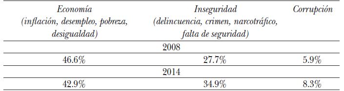 En ambos casos, las encuestas se llevaron a cabo cuando cada presidente iniciaba el segundo año de su gestión, entre los meses de enero y febrero, 2008 y 2014, respectivamente. La selección de los años 2008 y 20014, más allá de que fueron años en que había encuestas comparables disponibles, tiene que ver con las siguientes razones. En los meses de enero y febrero del 2008, no parecen haber noticias particularmente destacadas que pudieron haber ocasionado sesgos importantes en las percepciones de los ciudadanos con respecto del Presidente y su desempeño. Son años en los que la situación económica era relativamente estable, por lo que puede evaluarse mejor el peso real de los asuntos económicos en las evaluaciones de la gente, pues la variable económica gana importancia en situaciones de crisis, hiperinflación, decrecimiento económico, volatilidad.29 El segundo, por lo demás, es un año en que el presidente en turno ya debería de haber presentado su agenda de gobierno e implementar algunas medidas iniciales.