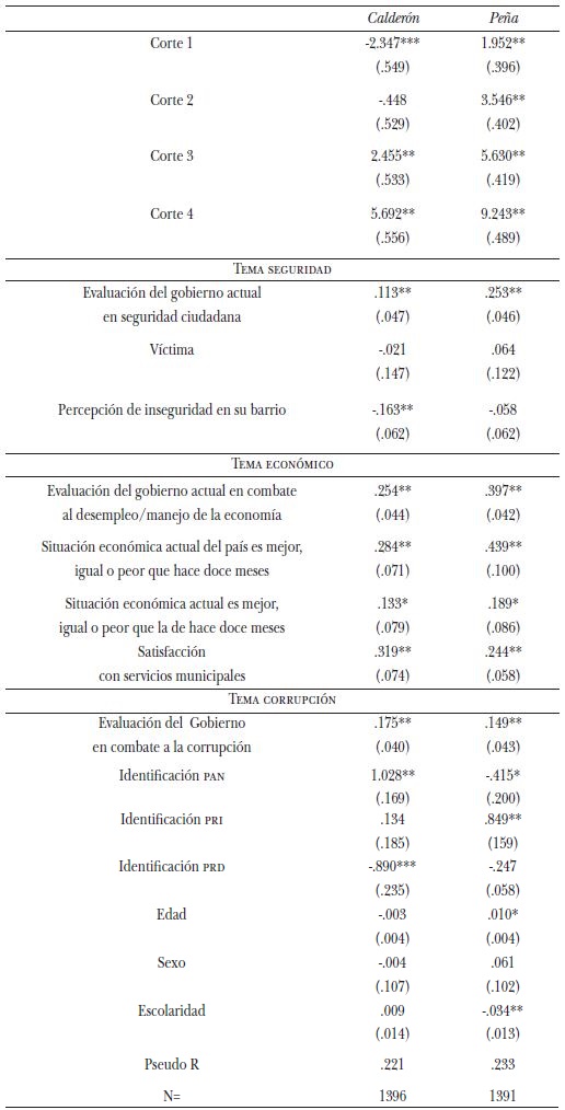 La variable dependiente (aprobación presidencial) está medida en una escala de cinco categorías. El fraseo de la pregunta es el que sigue: “Y hablando, en general, del actual gobierno, ¿diría usted que el trabajo que está realizando el presidente Felipe Calderón/ Enrique Peña Nieto es muy malo/ malo/ ni bueno ni malo/ bueno/ muy bueno?” (escala del 1 al 5).