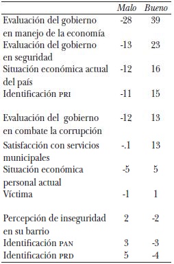 Tomando en cuenta los temas que aparecieron más en el análisis hemerográfico antes mencionado y los que la ciudadanía consideró como los más importantes del país, incluí como variables independientes tres grupos de factores relacionados con la economía, la inseguridad y la corrupción para medir cuál es el efecto neto de estos temas en la aprobación presidencial y, en especial, para saber si el tema económico prevalece sobre los otros dos.