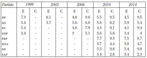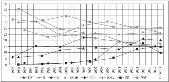 La tercera etapa en Escandinavia se caracterizó por la politización de la inmigración y el chovinismo de bienestar,21 ya que el porcentaje de inmigrantes y refugiados se incrementó significativamente en los países nórdicos.22 Resultado, éste, de dos factores, uno económico y otro político: por un lado, los nuevos patrones de producción capitalista en la globalización económica incentivaron el arribo de inmigrantes a los mercados más prósperos en Europa Occidental y, por otro, los refugiados expulsados por las guerras étnicas en Yugoslavia y los Balcanes fueron recibidos en estos países garantes de los derechos humanos. En estas circunstancias, la fortuna electoral de los partidos progresistas en Noruega y Dinamarca fue inversamente proporcional: el FRP se convirtió en un partido relevante entre 2001 y 2005, mientras que el FKP decreció hasta perder todos sus escaños en 2001, posición que se acentuó tras la salida de Kjærsgaard en 1995, cuando fundó el Partido Popular Danés (DF) para proteger el Estado de bienestar y combatir la inmigración y las sociedades multiétnicas.23 El DF recolectó los votos del FKP e ingresó al parlamento en 1998, hasta posicionarse hoy día como el segundo partido más votado en Dinamarca. Por su parte, en Suecia, la extrema derecha se reconfiguró, cuando los Demócratas Suecos (SD) irrumpieron en 1988 tras la fusión entre el Partido Sueco y el Partido del Reich Nórdico.24 En un inicio, los padres fundadores de los SD, Leif Zeilon y Anders Klarström, preservaron sus nexos con la escena neonazi, pero con la reestructuración del partido -bajo la gestión de Mikael Jansson- fueron expulsados los grupos supremacistas para legitimarse en la escena política. Sin embargo, este cambio no se reflejó en la votación de 1998. Por último, en Finlandia, Timo Sioni y Raimo Vistbacka refundaron el Partido Rural Finés bajo el nombre de los Auténticos Finlandeses (PS) en 1995. Este partido de raíces agrarias promovió una visión populista sobre la democracia, contrario a las élites y las burocracias, pero también se presentó como el protector del hombre común, ordinario y olvidado, opuesto a la clase corrupta en el poder.25 En su primera contienda electoral, los PS no capitalizaron sus propuestas de campaña en contra de la inmigración, el sistema político y la Unión Europea, por lo que no ganaron ninguna curul en la Cámara Baja.