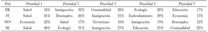 Últimamente, la desafección política, la crisis económica y el declive cultural han abonado un caldo de cultivo propicio para la inoculación de la xenofobia y el racismo de la extrema derecha en Escandinavia. Ante un contexto de inestabilidad e incertidumbre, la gestión socialdemócrata -encadenada por su tradicional compromiso con la beneficencia, el refugio y los derechos humanos-, ha fracasado en solucionar las peticiones de sus electores, cuyos reclamos se centran en mejorar las prestaciones y los servicios otorgados por el Estado. Según el Eurobarómetro de 2017, los ciudadanos nórdicos exhortan a su gobierno a que enfrente los problemas relacionados con la salud, el paro, la inmigración, entre otros41 (véase Cuadro 1, de la siguiente página).