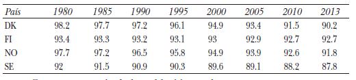 Durante casi todo el siglo XX, la socialdemocracia gobernó como el partido predominante en los regímenes democráticos nórdicos.45 Esta posición en el tablero político fue resultado del Estado de bienestar proveedor de una extensa red de prerrogativas en materia de salud, educación, vivienda, pensiones. Sin embargo, la crisis de la izquierda se originó en los noventa, cuando el Comunismo hizo crisis, etapa en la cual la socialdemocracia enfrentó una disyuntiva, es decir extenderse hacia la izquierda para recolectar el voto obrero con una visión estatista o recorrerse hacia el centro para obtener posiciones en el gobierno con tintes neoliberales. Los socialdemócratas se inclinaron por esta última opción. La izquierda, con esta decisión, abandonó definitivamente el voto proletario, el cual se refugió en los partidos nacionalistas -promotores de la beneficencia exclusiva para los nativos-, cuyos integrantes han sido calificados irónicamente por Ove K. Pedersen como “la extrema derecha socialdemócrata”.