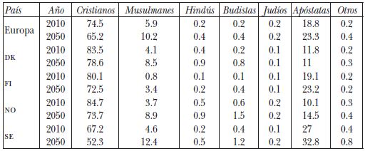 En el siglo que corre, el discurso de la extrema derecha se ha reorientado para extender su base electoral. Ahora ya no rechaza a una inmigración en general, sino a una en particular: los creyentes del Islam. Después del atentado terrorista de 2004 en Madrid, España, estos partidos políticos han culpado a los musulmanes de la inseguridad, la criminalidad y la decadencia en Occidente e insisten que la “invasión extranjera” procedente del mundo islámico condiciona el futuro del pueblo nórdico, puesto que -en su visión etnocéntrica-, la civilización cristiana es incompatible con el Corán. Desde entonces, los grupos islamófobos han brotado por toda Escandinavia: el Movimiento de Resistencia Nórdico, la Liga de la Defensa Europea, los Patriotas Europeos contra la islamización de Occidente y los Soldados de Odín. Según los pronósticos del Pew Research Center, la religión islámica aumentará en las próximas décadas en el Viejo Continente de forma inversa proporcionalmente a la religión cristiana. En los países nórdicos, la presencia de los feligreses de Alá crecerá paulatinamente en Finlandia, Dinamarca y Noruega, pero aún más en el caso de Suecia (véase Cuadro 5).