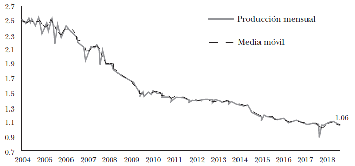El perfil de la producción petrolera de México responde al ciclo vital de sus yacimientos, sobre todo al de sus campos supergigantes y gigantes. Típicamente, la producción de un campo petrolero avanza en un inicio por una senda expansiva según se incorporan nuevos pozos hasta alcanzar una plataforma en la que tiende a estabilizarse, cuando nuevos pozos compensan la declinación de otros más antiguos. Alcanzada la producción máxima, comienza la declinación. De manera convencional, ésta puede separarse en tres fases. Primero, cuando la producción desciende al 50% del nivel pico, después al 25% y finalmente se agota.5 México está cerca de terminar la primera fase de su declinación. En el primer semestre de 2018, la producción de petróleo obtenida equivalió a menos del 55% del nivel máximo alcanzado en diciembre de 2003.6