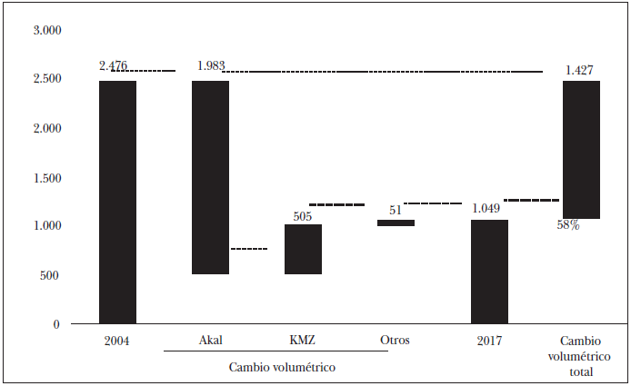 A la inversa de Akal, que alcanzó su producción máxima e inmediatamente comenzó a declinar, kmz ha logrado mantener una producción relativamente estable por un periodo de siete años. Sin embargo, es pertinente observar las diferentes trayectorias de cada uno de los campos que lo conforman. La producción máxima de Ku se registró en 2009, seguida por Zaap en 2014 y es muy posible que Maloob esté por alcanzar o haya alcanzado ya su pico de producción. Este patrón no sólo contribuyó a la estabilidad de la producción, sino que hace más factible que la declinación de kmz sea más gradual que la de Akal. La dinámica descrita de la producción modificó la calidad del crudo extraído, haciéndolo cada vez más pesado, dado que Maloob y Zaap producen crudos de mayor densidad que Ku. El comportamiento del volumen y de la calidad de crudo de kmz es crucial, puesto que en 2017 el 77% de la producción de crudo pesado del país provino de este complejo, que contribuyó a una proporción aún mayor que las exportaciones de crudo pesado. Otros campos marinos aportaron el 16% de la producción y campos terrestres el 6% restante