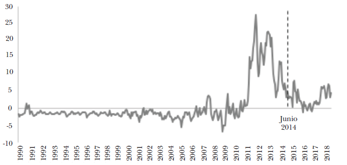El diferencial de precios entre el Maya y el lls tendió a reducirse por la mayor producción de crudos ligeros en Estados Unidos, respecto a la disponibilidad de crudos pesados, particularmente en el Golfo de México, dada la baja de las exportaciones de México, Venezuela y otros países sudamericanos. Asimismo, cuando los países de la opep adoptan cuotas de producción, los primeros crudos que se sujetan a un recorte volumétrico son los pesados, cuyos precios son más bajos. La reducción del diferencial entre crudos ligeros y pesados disminuye la rentabilidad de las refinerías complejas, restándoles ventaja competitiva. En la gráfica 4 se observa con claridad la compresión del diferencial entre estos crudos.47 A partir de la segunda mitad de 2017, este diferencial se amplió nuevamente por el mal funcionamiento de la fórmula del Maya y por un esfuerzo de ventas errático.