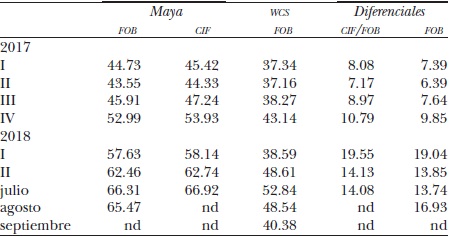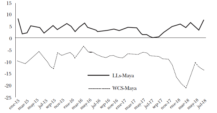 En fechas recientes, dos interrupciones sustanciales de producción en Alberta redujeron el diferencial por abajo del umbral de 7 dólares: en junio y julio de 2015, por los devastadores incendios en Alberta, y en mayo y junio de 2017, como resultados de la explosión de una planta de Syncrude. En 2015 y 2016, el diferencial de precios entre el wti y el wcs promedió 13.52 y 13.84, pero en mayo y junio de 2015 descendió temporalmente a 8.54 y 7.44 dólares por barril respectivamente, lo cual cubrió el descuento de calidad, pero sólo una fracción del costo de transporte. Durante estas restricciones puntuales de suministro, se redujo el flujo de crudo canadiense al Golfo, llegando sólo al Medio Oeste. México pudo haber aprovechado estos dos eventos para retomar participación de mercado, pero no hay evidencia de que lo haya intentado. En 2018, las restricciones de transporte del wcs a las que se ha aludido incrementaron de manera sustancial los diferenciales entre el Maya y el wcs.