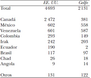 En el cuadro 4, figuran los principales países que exportan crudos pesados a Estados Unidos y, en particular, a la costa del Golfo. Puede observarse que esta región absorbió el 45% del crudo pesado importado por Estados Unidos y que el 79% del crudo que se importó a esta región provino de cuatro países, todos del hemisferio occidental. Reluce el hecho de que Canadá sólo exporta al Golfo el 15% del crudo que envía a Estados Unidos por consideraciones logísticas y que el crudo ecuatoriano tiene como principal destino la costa occidental de dicho país. Otra fuente potencial de crudo pesado es Irak. Sus exportaciones totales de Basrah Heavy ascienden a unos 810 mbd y tienen a Asia por su principal destino. De esta corriente, fluyen unos 165 mbd, aproximadamente el 20% a refinerías del Golfo.