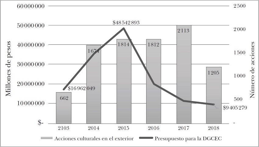 Como también puede apreciarse en la gráfica 1, no hay correlación entre presupuesto asignado y número de iniciativas o acciones, lo cual provoca enormes dudas sobre las metodologías aplicadas por la Amexcid. Así, en 2013 se consigna un presupuesto de 16.9 millones de pesos y la DGCEC reporta 662 acciones para ese periodo, es decir, el costo promedio anual por acción cultural internacional para la SRE fue de 25 600 pesos. En 2015, el presupuesto se elevó a 48.5 millones de pesos, el triple que el primer año. A su vez, se reportó un total de 1814 acciones, también casi tres veces más que en 2013. Y, en 2015, cada acción cultural le costó a la SRE 26 700 pesos, cifra similar a la de 2013. Esta constancia se pierde en los tres años siguientes, como se aprecia en la gráfica 1. Hay mucho menos presupuesto disponible para la DGCEC, pero el número de acciones se mantiene e, incluso, crece en 2017, para caer en 2018. Este último año el presupuesto fue de 9.4 millones de pesos y se reportaron 1205 acciones, lo que equivale a un costo unitario de 7800 pesos.