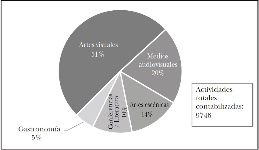 En cuanto al tipo de actividades que se realizaron, es importante decir que siguieron predominando las artes visuales (51%), seguidas de los medios audiovisuales (20%) y, en menor medida, las artes escénicas (14%) y las conferencias y la literatura (10%). Lo que esto nos dice es que se mantiene una visión tradicional del trabajo de la diplomacia cultural, tanto en las propuestas como en la práctica, y que los operadores no pudieron ir más allá de estos enfoques tradicionales. El sexenio anterior al de EPN siguió la misma ruta.