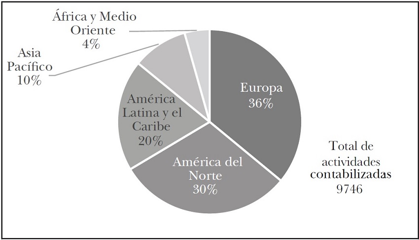 Como puede observarse en la gráfica 1, el volumen de acciones culturales (9746) tuvo fluctuaciones anuales que permiten observar los cambios experimentados por este indicador. El año con más acciones en el exterior fue 2017 (2113) y en el que menos hubo fue 2013 (662). Durante 2014, 2015 y 2016 se presentó una relativa estabilidad en el número de acciones, pero en 2018 la cifra es casi de la mitad del año previo.
