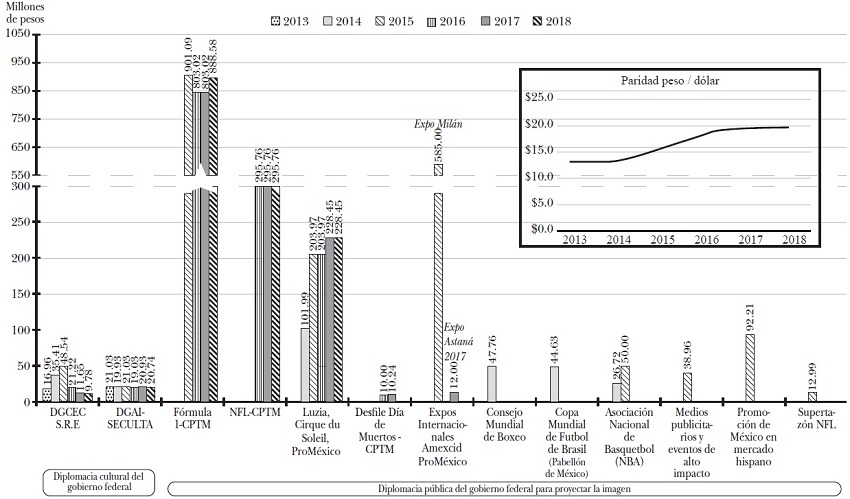 El CPTM25 también patrocinó partidos de la NFL celebrados en México durante tres ocasiones, con un costo total de 888 millones de pesos. La misma institución patrocinó, en cuatro ocasiones, el Campeonato Mundial de Fórmula 1 de la Federación Internacional de Automovilismo, con un costo total en el sexenio de 3 462 000 millones de pesos,26 la mayor cifra de todos los rubros tomados en cuenta aquí. En cuanto a la promoción de la marca México en eventos de alto impacto, se erogaron 13 millones de pesos en los partidos de la NFL y 76 millones de pesos en juegos de la National Basketball Association, de EEUU, por mencionar algunos ejemplos. En el caso de la DGAI de la SC, el monto sexenal llegó a los 123 millones de pesos. Sumado esto último con el presupuesto de la DGCEC-SRE, los recursos para la diplomacia cultural en el gobierno de Peña Nieto ascienden a 267 millones de pesos. La desproporción con las otras áreas es más que evidente.