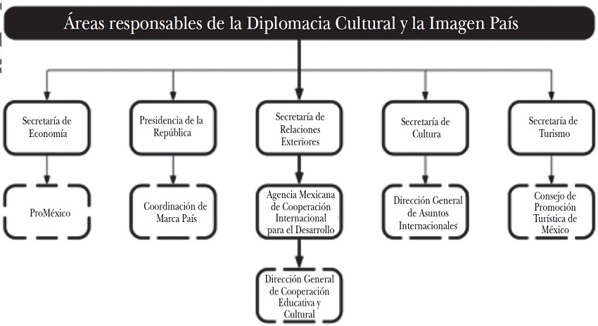 En un segundo nivel, es pertinente revisar cómo se asocian estos rubros con otras áreas del gobierno (véase la figura 1), principalmente la hoy Secretaría de Cultura (SC) -que hasta 2016 fuera el Consejo Nacional para la Cultura y las Artes- y la Secretaría de Economía, en especial ProMéxico y el Consejo de Promoción Turística de México (CPTM). En un tercer nivel no menos importante, se incorporan, también en el ámbito federal, la Coordinación de Marca País y Medios Internacionales de la Presidencia de la República y la Secretaría de Turismo. En un cuarto nivel, de orden estatal, existen las diversas oficinas de asuntos internacionales de las entidades de la Federación, que atienden temas asociados con su promoción y la cooperación a nivel federal. Finalmente, se tienen diversas agencias públicas o privadas que ejercen actividades de promoción cultural e imagen en el exterior, con una agenda muy específica, como es el caso de la Universidad Nacional Autónoma de México, el Instituto Politécnico Nacional, la Universidad de Guadalajara y otras instituciones similares con presencia e interés en el ámbito académico internacional.