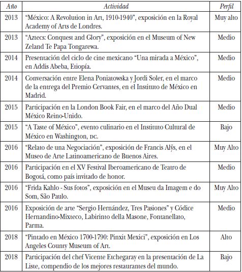 Resulta muy sorprendente conocer lo poco que los diplomáticos activos, en general, entienden de la cultura. Más complejo aún es instrumentar una política exterior desde donde apropiarse de la cultura como una herramienta diplomática. Por su naturaleza, el tema cultural convoca a diversas áreas del quehacer público. Es momento de establecer para este artículo, cómo se utilizó la cultura como una estratagema desde el gobierno federal, fundamentalmente desde la SRE y la SC. Como se puede observar en el cuadro 1, que recoge algunas acciones selectas, la cultura ha sido una herramienta de proyección de identidades mexicanas, con un sustrato histórico basado en las grandes civilizaciones antiguas, figuras célebres de la literatura y la pintura del siglo XX, y que incluye algunos personajes vivos con una trayectoria reconocida en el campo de las artes. Esta línea discursiva no varía mucho de lo que se ha venido haciendo desde, al menos, 1990, cuando se estableció el canon propuesto por “México: Esplendores de treinta siglos”,16 la exposición emblemática que proyectó al país hacia Norteamérica en el gobierno de Carlos Salinas de Gortari.