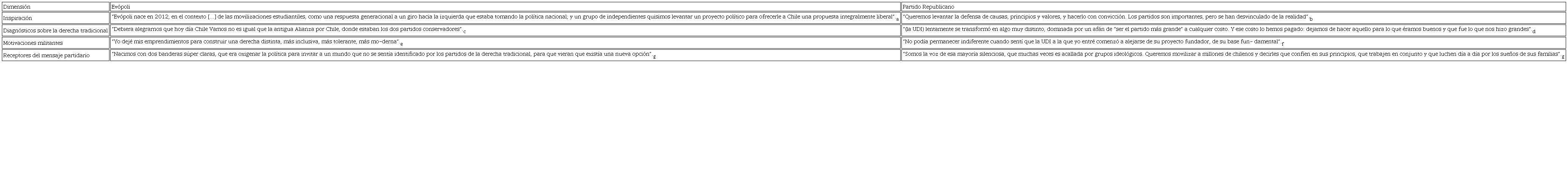 Estos agenciamientos diferenciales se fueron sedimentando, pasando a formar parte de las identidades de ambos partidos. Mientras Evópoli fue gestando su perfil en torno al encadenamiento metonímico entre los significantes “juventud”, “innovación”, “renovación” y “liberalismo”, en el caso del PR, su ethos partidario se configuró en torno al protagonismo de significantes tales como “principios”, “convicciones” y “derecha verdadera”.