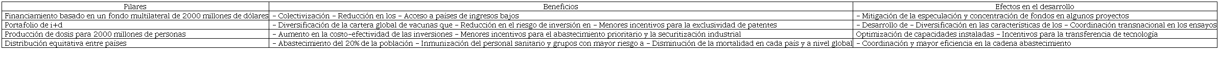 Frente a la competencia internacional, el 26 de junio, el ACT-Accelerator de la OMS propuso la formación de COVAX, un fondo multilateral con financiamiento gubernamental y privado para el desarrollo, la producción y la distribución equitativa de vacunas entre países durante 2021. Aunque la iniciativa era una solución parcial a la disputa, esta organizaría a financiadores, desarrolladores, productores y consumidores, lo cual, entre otros beneficios, diversificaría las vacunas disponibles, ampliaría el acceso y reduciría tanto los costos globales de la inmunización como los incentivos para el acaparamiento y el uso político (véase el cuadro 1).106 La iniciativa sumó el apoyo de 150 países, entre ellos, Alemania, Sudáfrica, Corea y México. Sin embargo, la ausencia de EE.UU., China y Rusia, competidores centrales, impidió que COVAX se constituyera como un esquema organizativo efectivo.107
